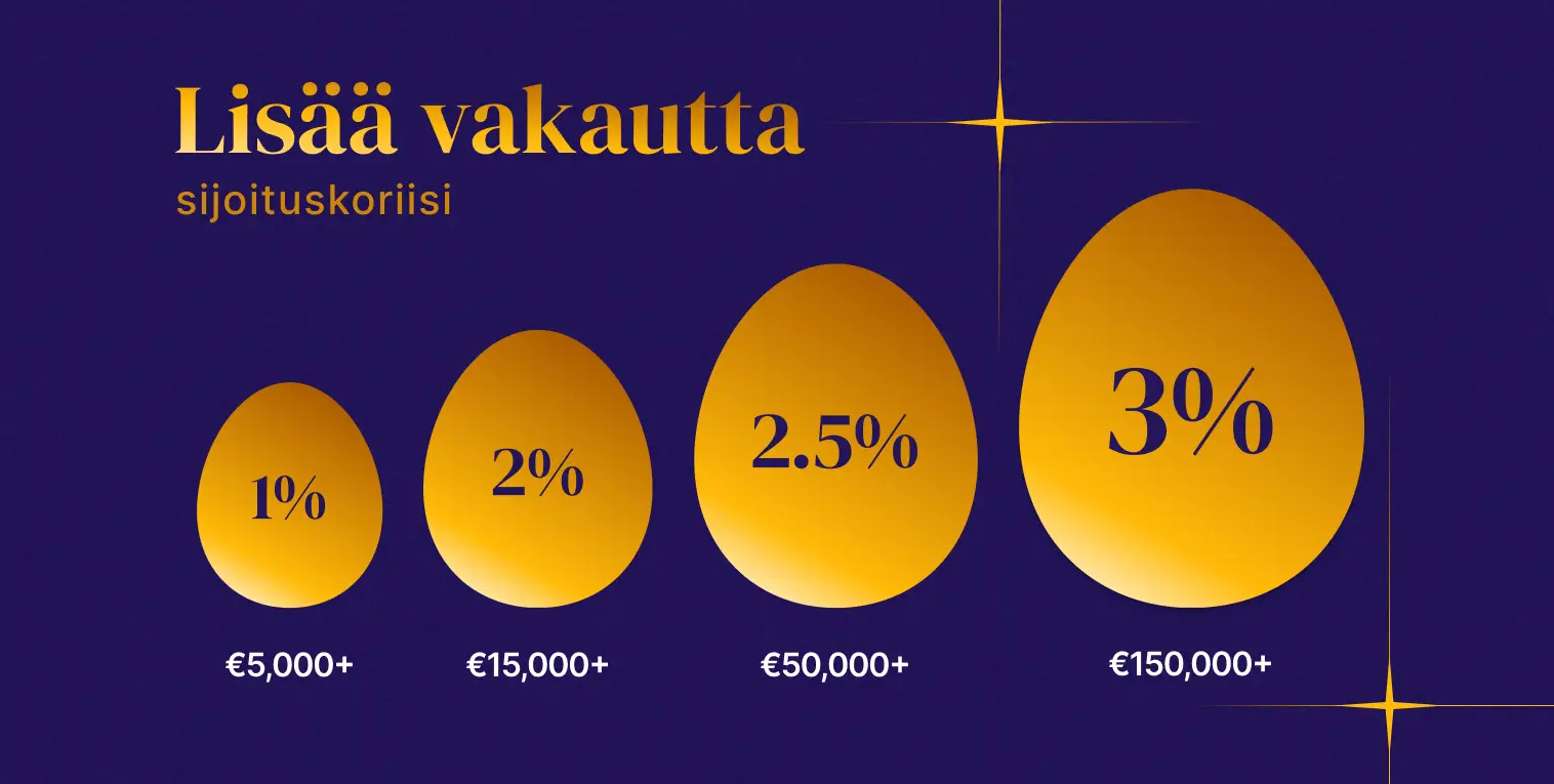 Tänä joulukuussa voit piristää juhlakauttasi jopa 3 %:n cashback-bonuksella, kun sijoitat uusia varoja kampanjalle varattujen Auto Invest -salkkujen kautta. Se on täydellinen tapa päättää vuosi vahvasti: bonuksesi maksetaan jo lomakauden aikana, samalla kun sijoituksesi tekevät jo