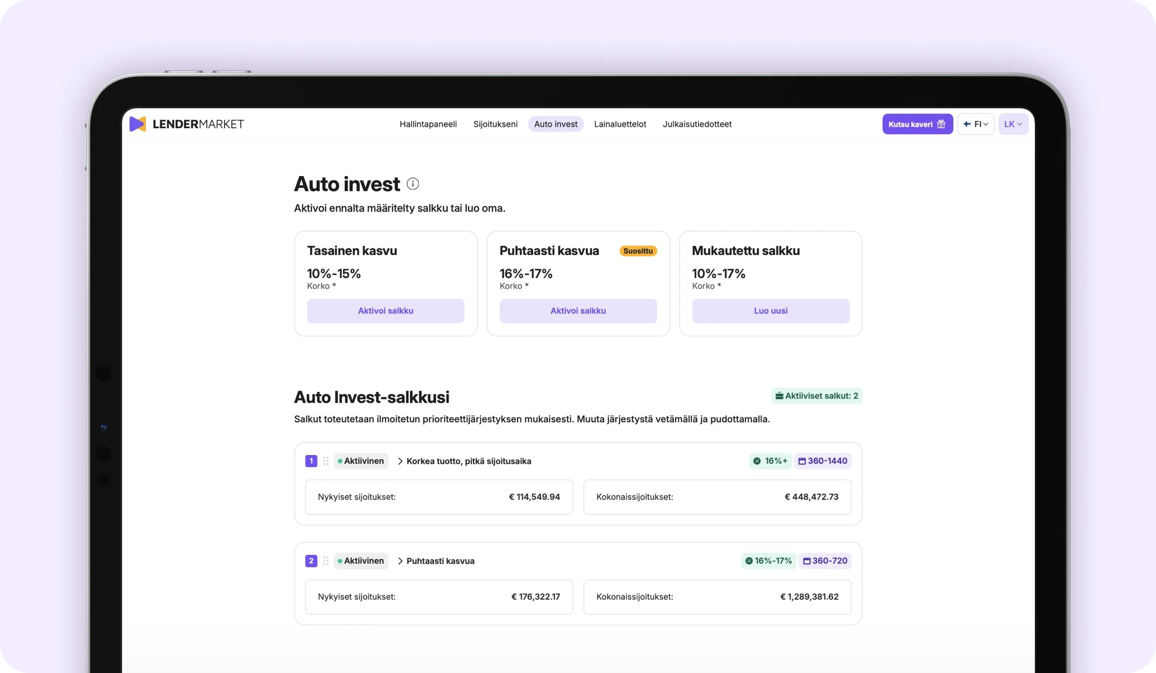 Auto Invest sijoittaa automaattisesti käytettävissä olevan saldosi valitsemiisi kriteereihin sopiviin lainoihin ja sijoittaa tuoton uudelleen maksimoidakseen tulot. Näin jokainen, huolimatta osaamisestaan, pystyy sijoittamaan Lendermarketin kautta. Me uskomme, että sijoittamisen tulisi olla helpompaa ja kaikkien ulottuvilla, ja Auto Invest-toiminto takaa tämän.
