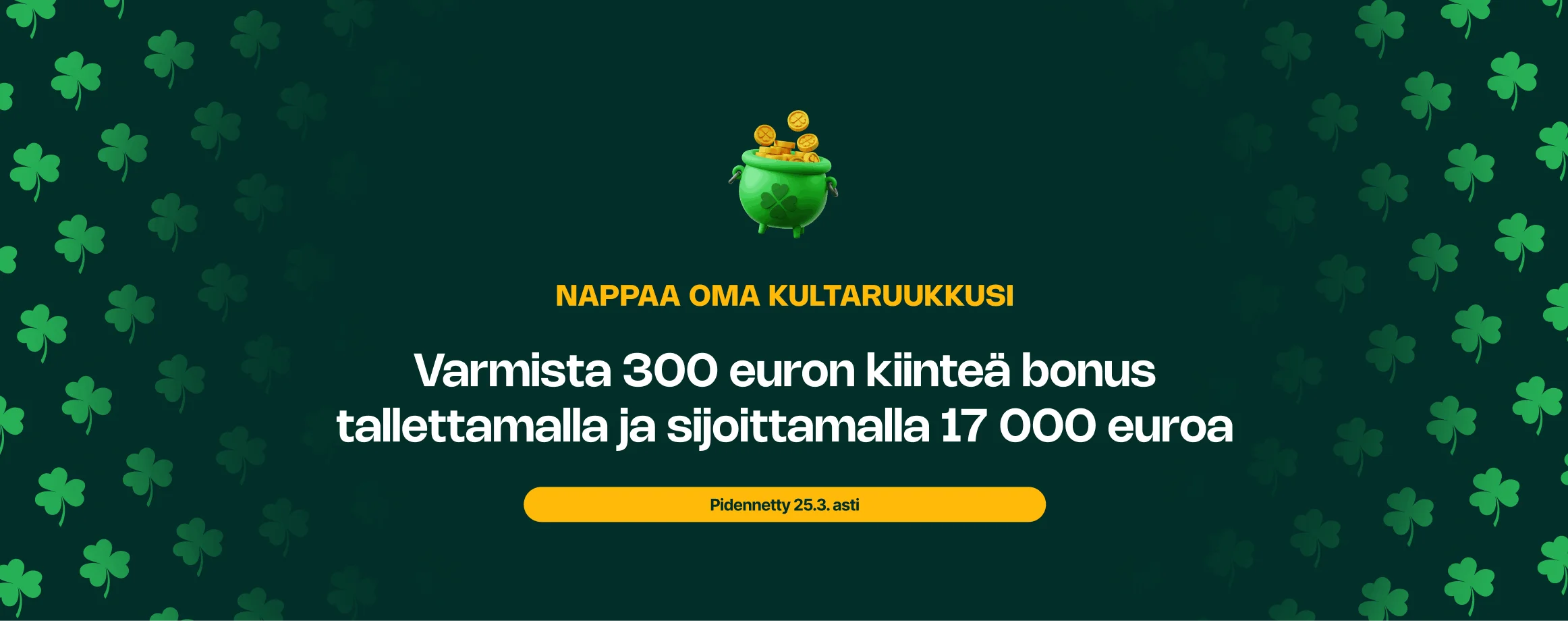 Pyhän Patrickin päivän henki elää Lendermarketilla edelleen vahvana. Olemme pidentäneet tätä erityistä kampanja-aikaa, joten sinulla on nyt aikaa keskiviikkoon 25. maaliskuuta asti kasvattaa salkkuasi ja lunastaa kiinteä 300 euron bonus.